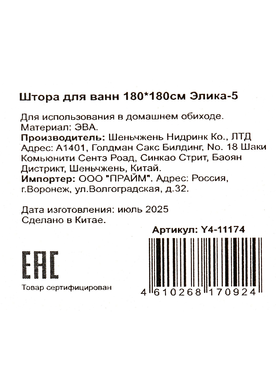 Штора для ванн 180х180 см, PEVA, Элика-5, Y4-11174