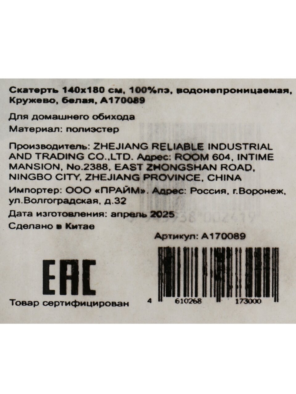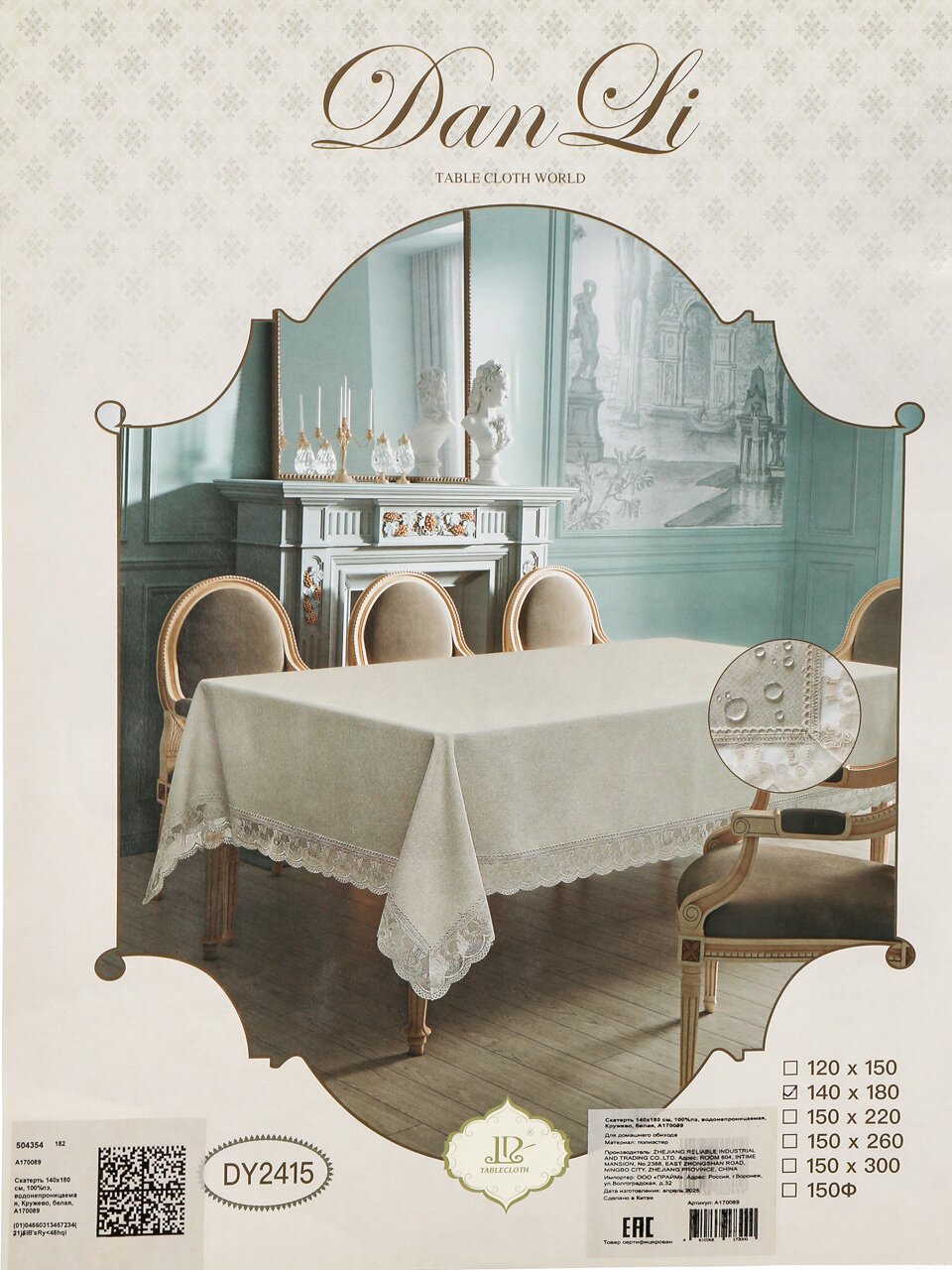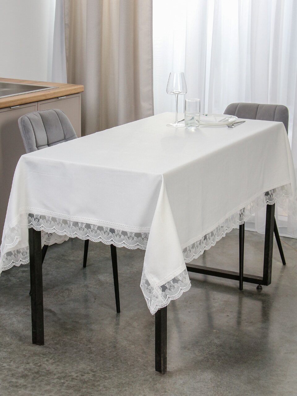 Скатерть 140х180 см, 100%пэ, водонепроницаемая, Кружево, белая, A170089