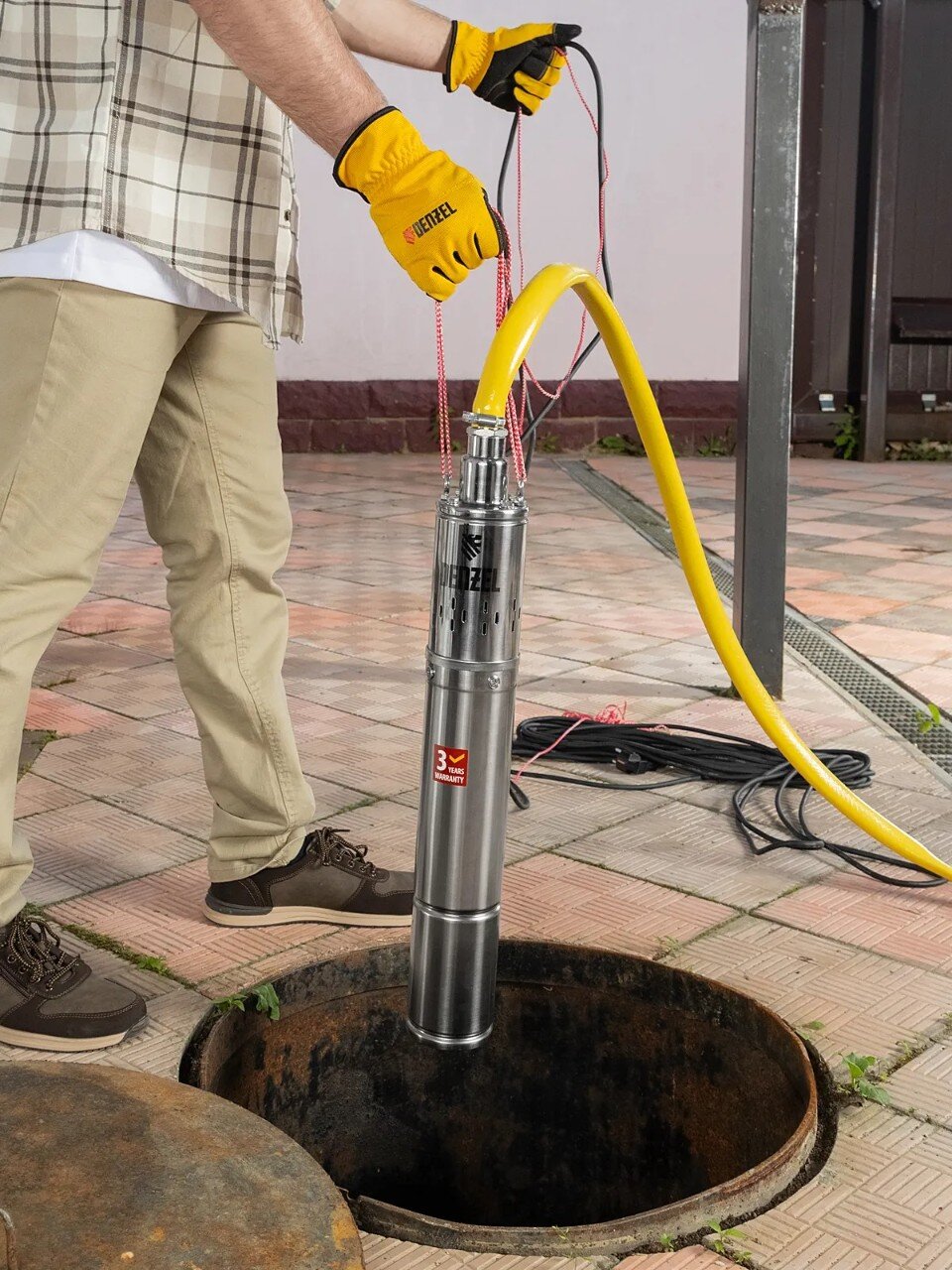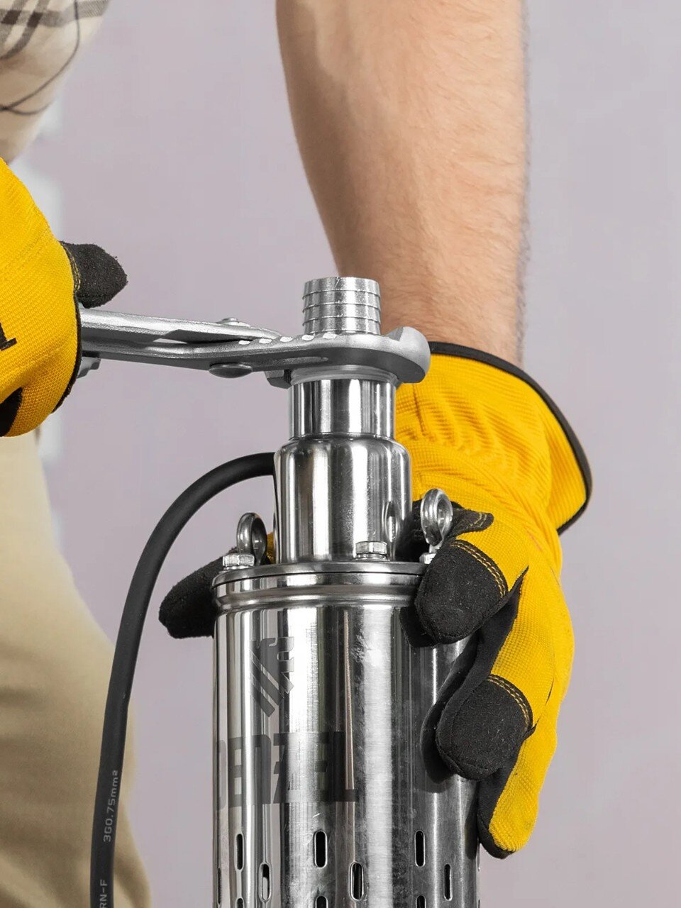 Максимальный напор составляет 100 метров — этого достаточно для подачи воды из глубоких скважин в дом или на участок.