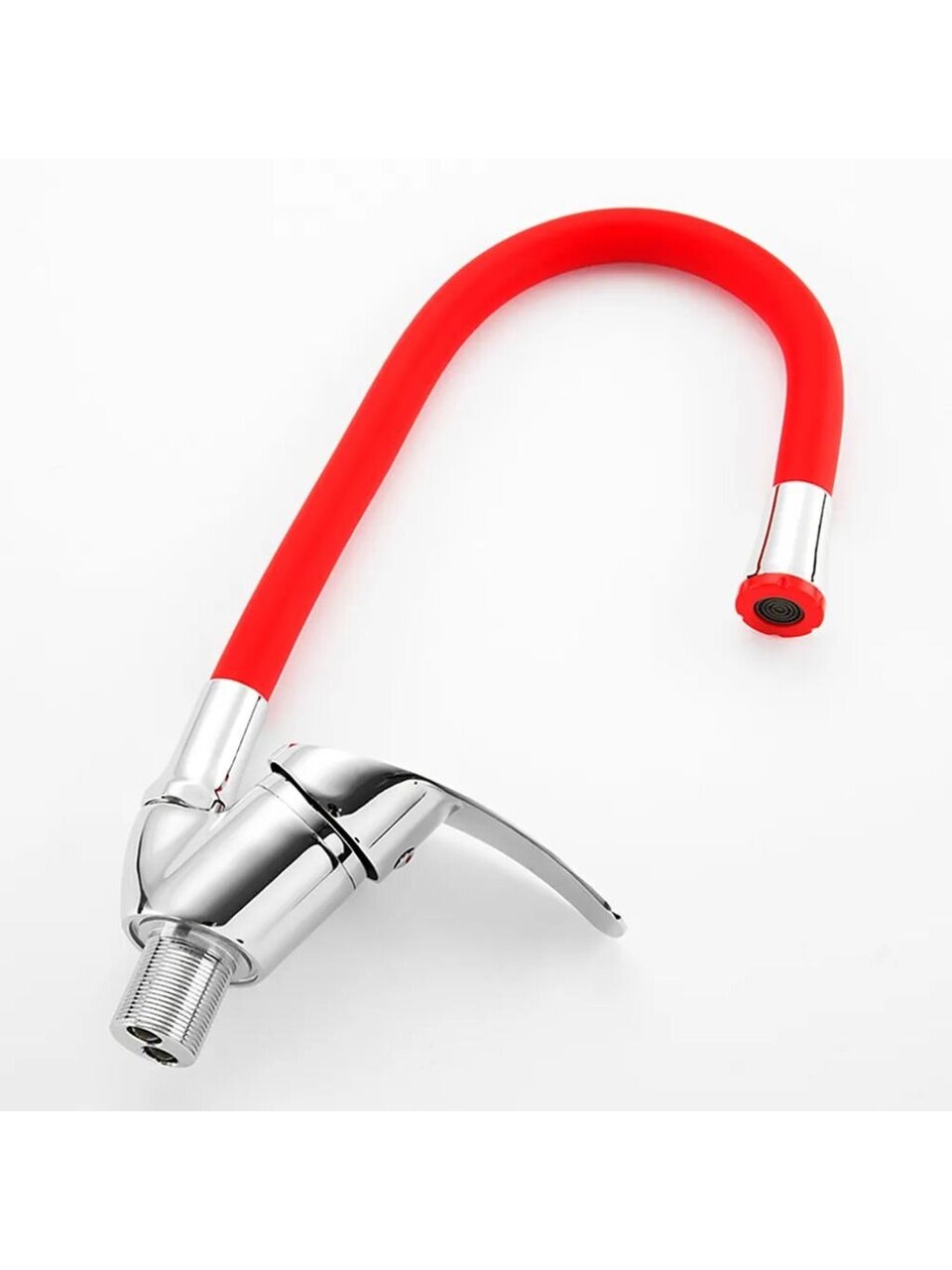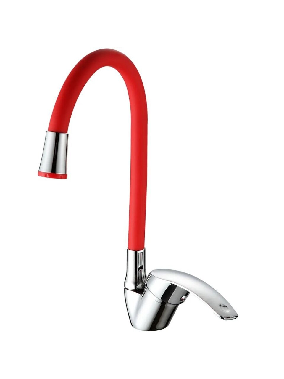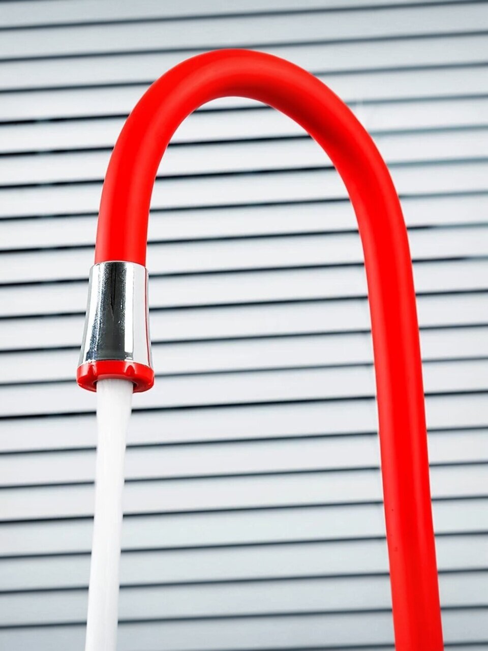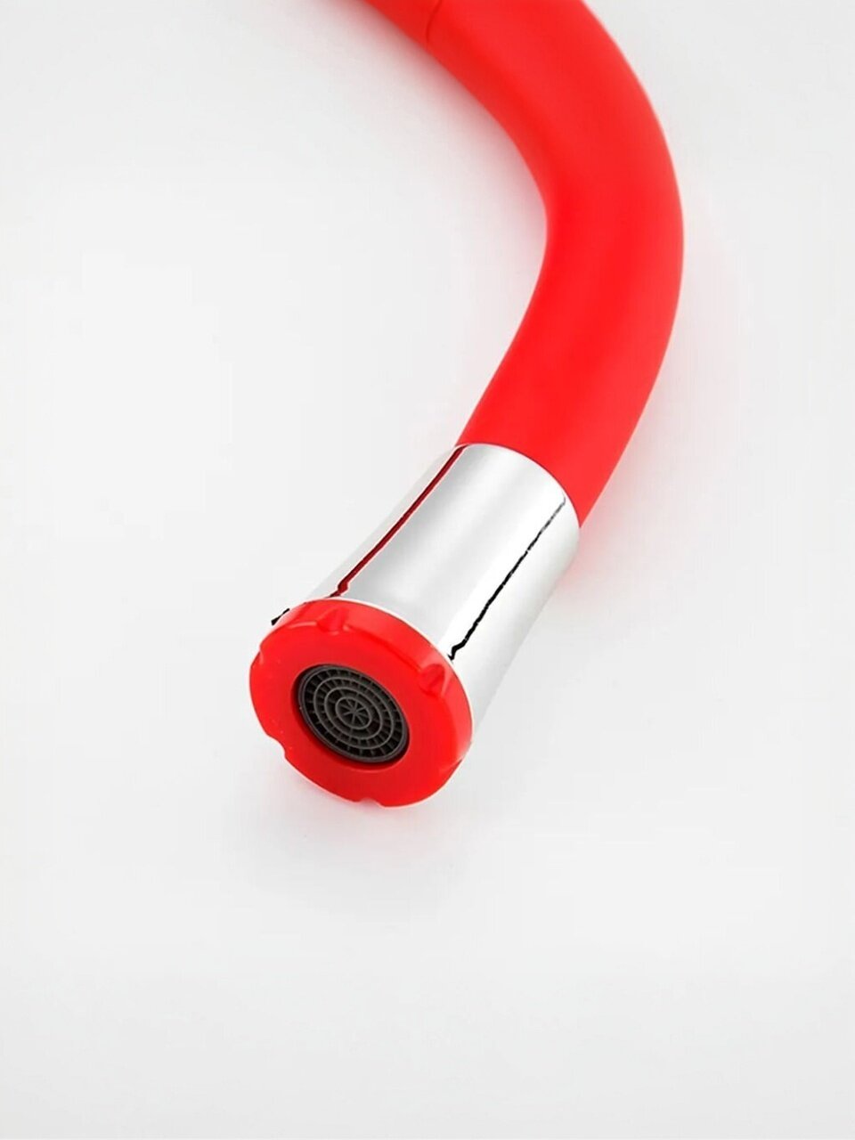 Корпус изготовлен из алюминия, форма круглая, длина излива — 17 см, стандарт подключения — 1/2". Цвет — красный, стиль — современный.