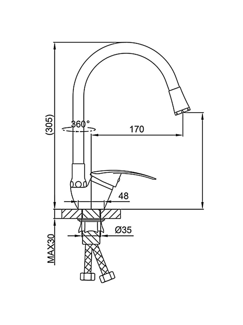 Смеситель устанавливается горизонтально через одно монтажное отверстие диаметром 48 мм, крепление осуществляется гайкой. Подходит для большинства кухонных моек.