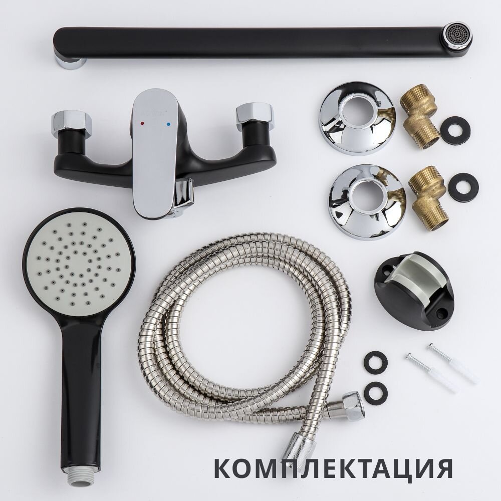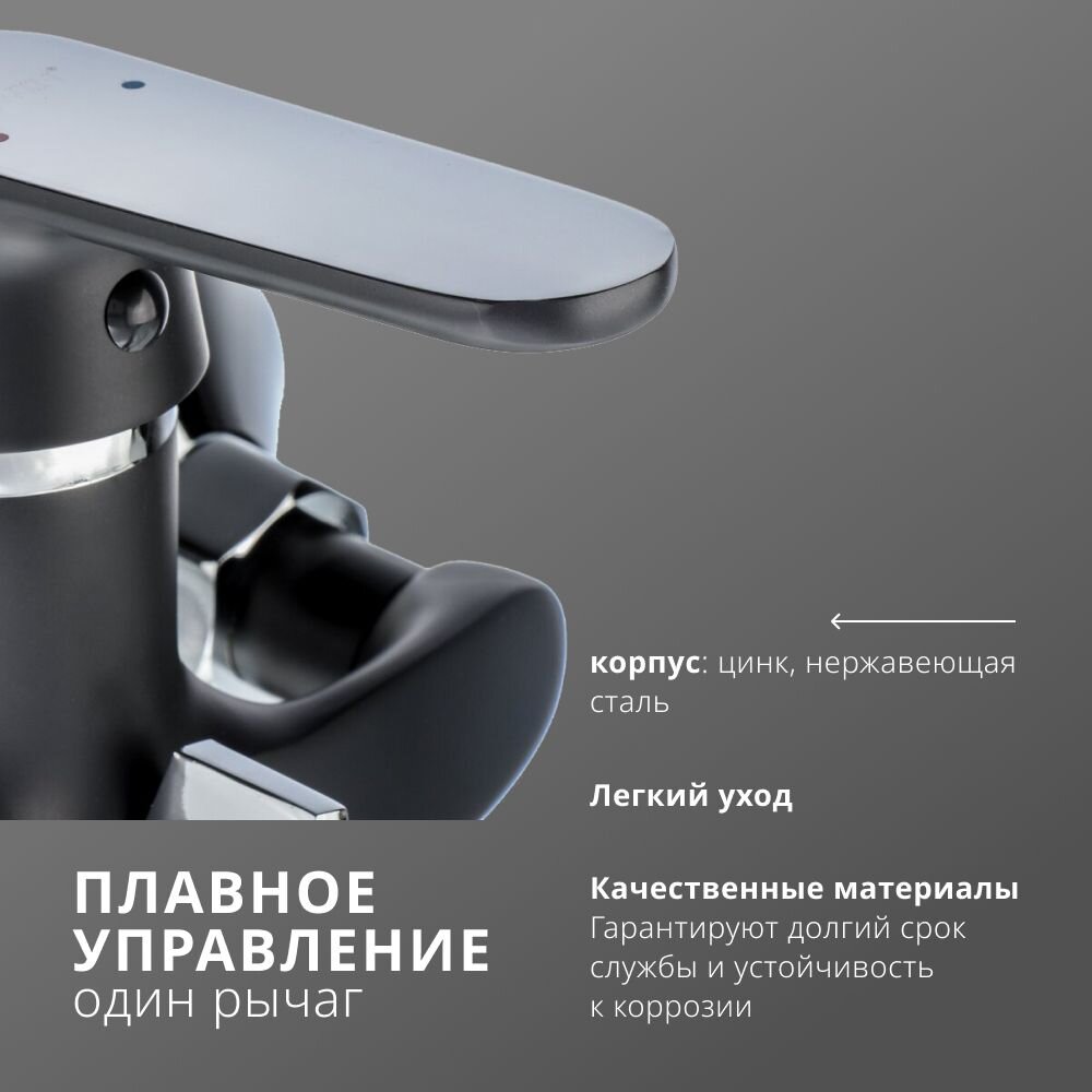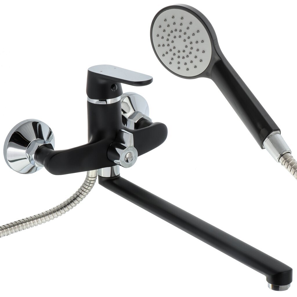 Смеситель для ванны Aqwin A22118-6: стильный черный дизайн, надежный керамический картридж, поворотный длинный излив 35 см — оптимальное решение для современной ванной.
