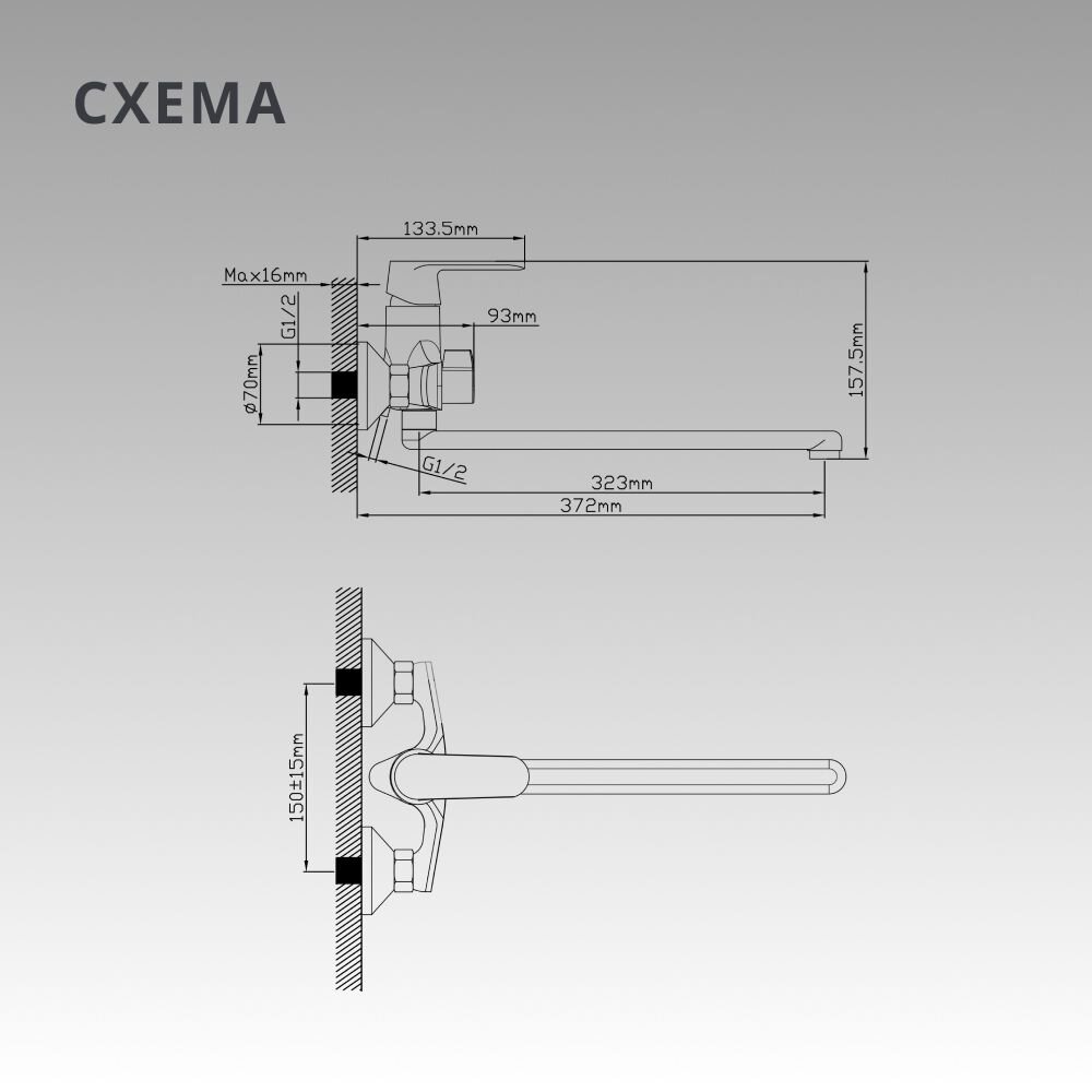 Длина излива — 35 см, тип — поворотный, форма — плоская, межосевое расстояние для монтажа — 150 мм, стандарт подключения шланга — 1/2".