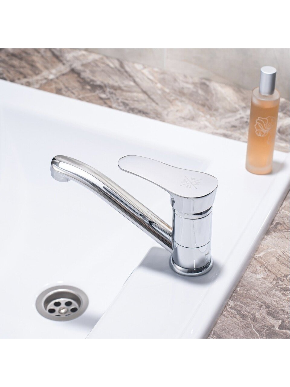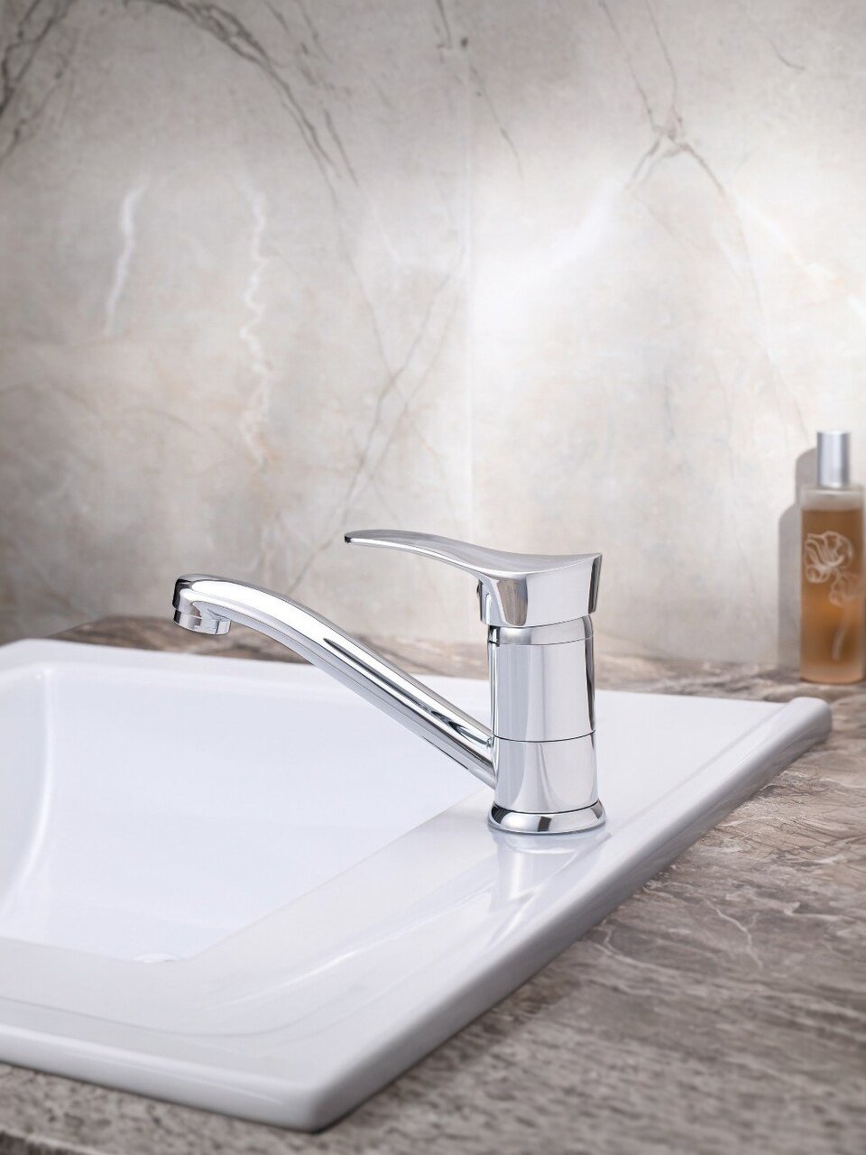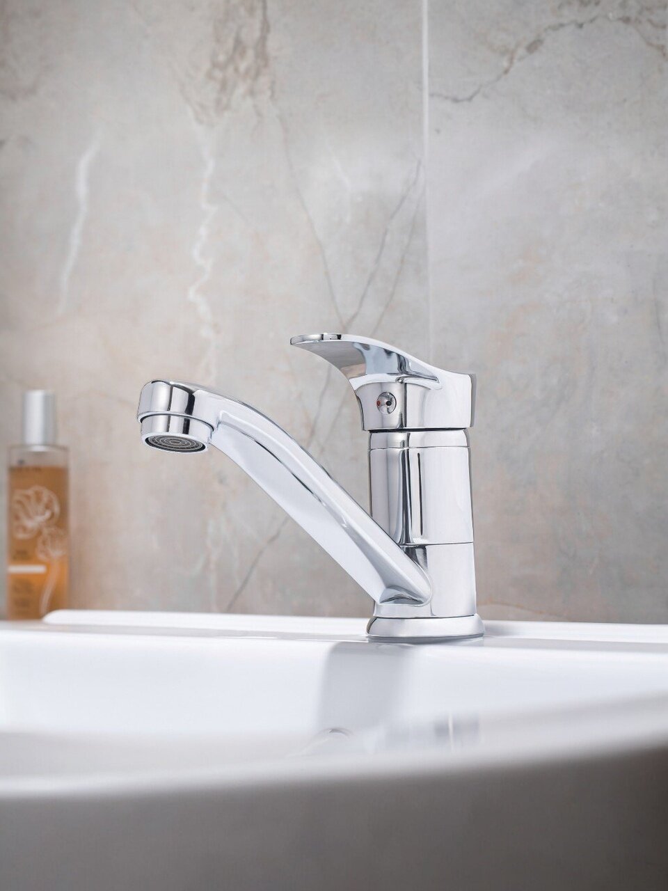 - Корпус из цинкового сплава с глянцевым хромированием: износостойкость, современный вид, компактные размеры (излив 14.8 см, высота 7.7 см)