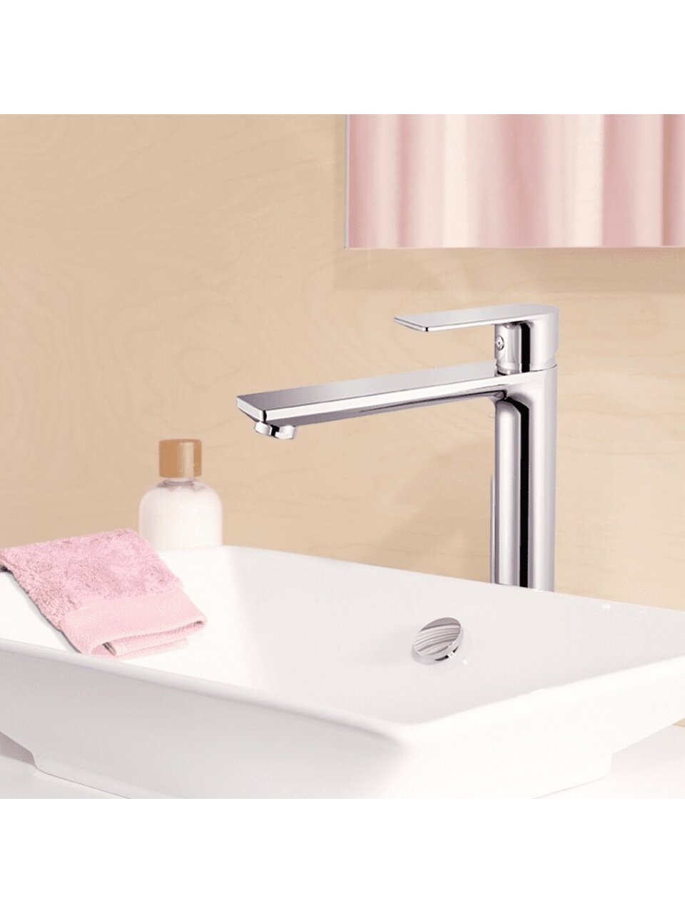 - Уникальный дизайн: плоская форма, глянцевое хромированное покрытие и высокий излив подчеркивают современный стиль ванной.
