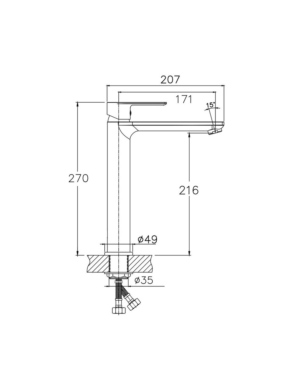 Смеситель устанавливается горизонтально в одно отверстие диаметром 35 мм, крепится гайкой, стандарт подключения — гибкая подводка 1/2".