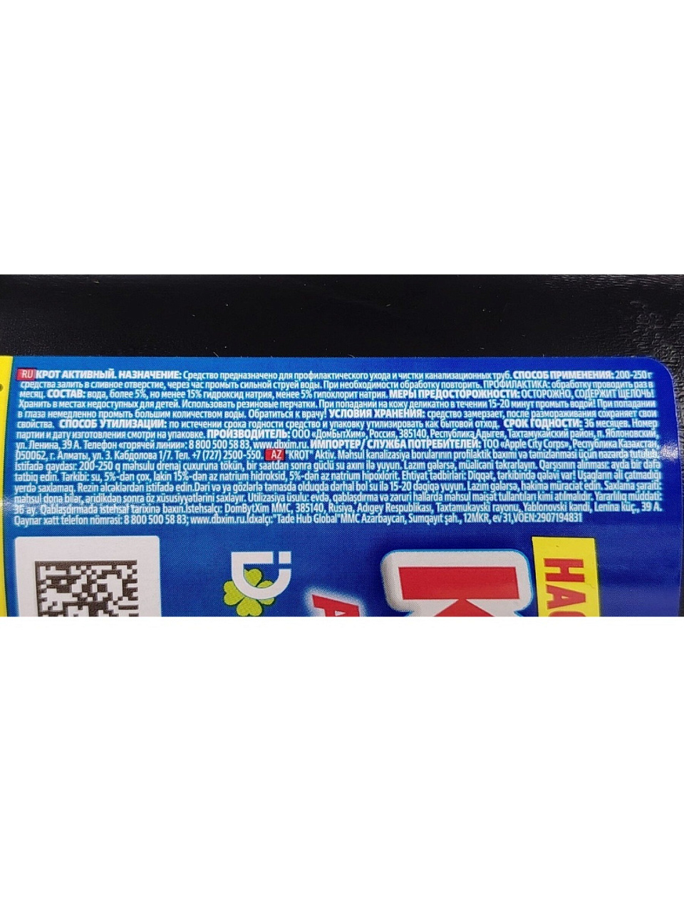 Средство от засоров Крот Активный 1 л — быстрое решение для сложных засоров труб в доме и на даче, эффективен даже при сильных загрязнениях.