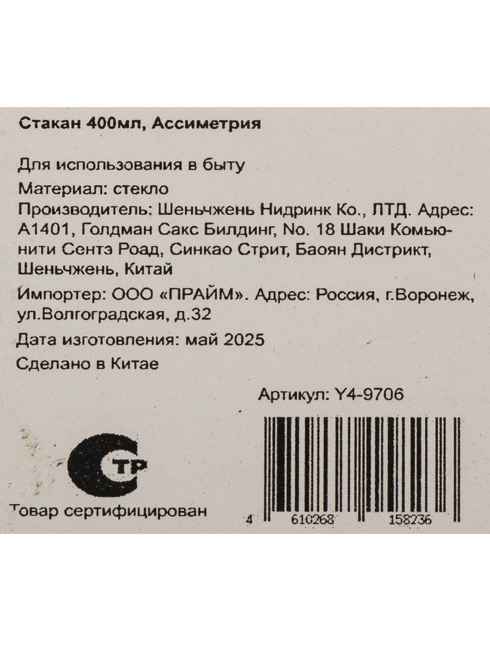 Стеклянный стакан 400 мл «Ассиметрия» — стильное решение для воды, сока и коктейлей. Лёгкость ухода, современный дизайн и универсальность для дома и дачи.