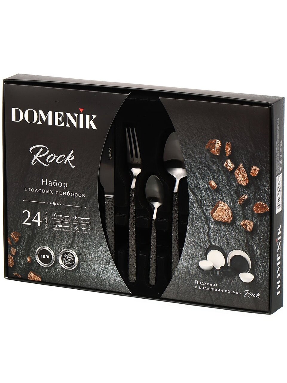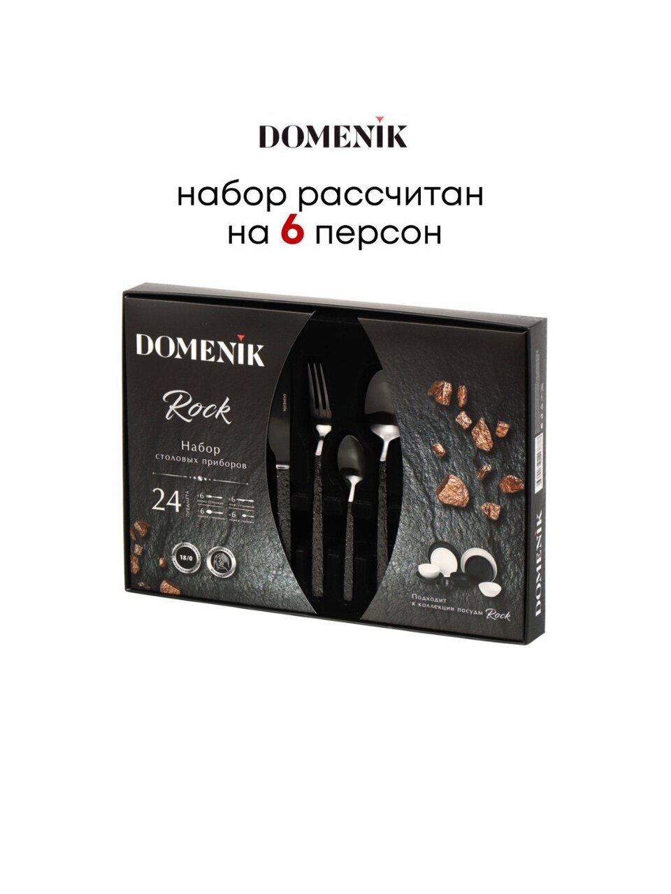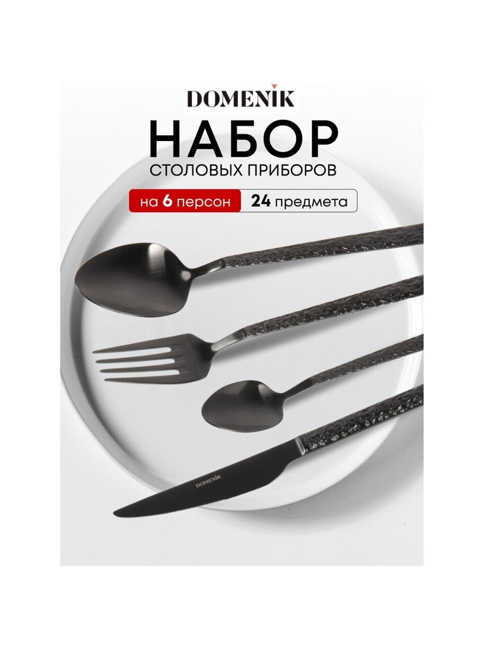 Премиальный набор столовых приборов Domenik Rock Black 24 предмета — стильный подарок и практичное решение для сервировки на 6 персон. Черная сталь, подарочная упаковка.