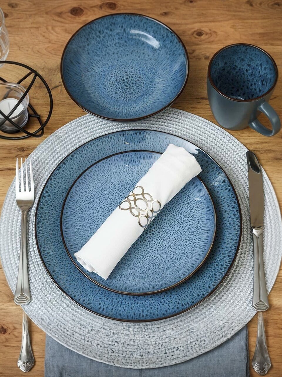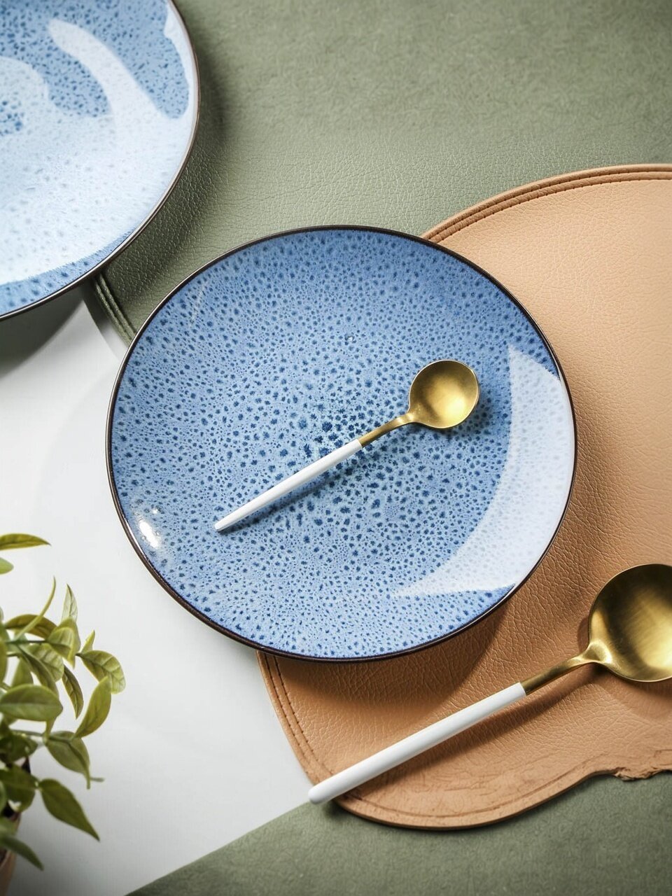 - Уникальный дизайн: глубокий синий цвет, современный узор в крапинку — акцент на индивидуальность вашей сервировки