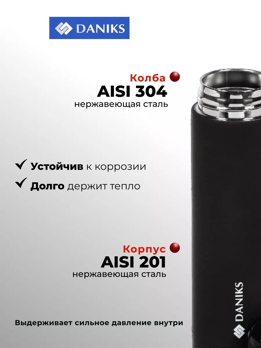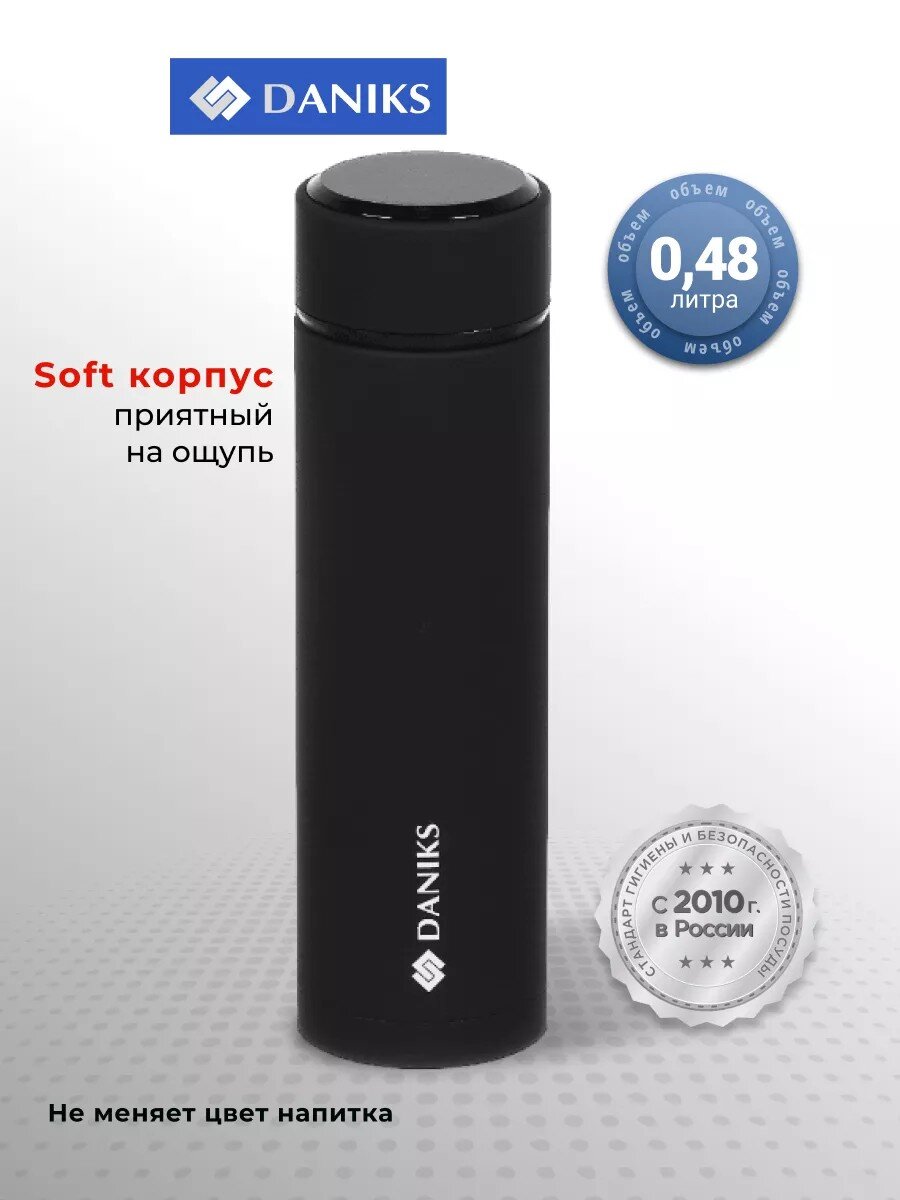 Термос Daniks 0.48 л с датчиком температуры: сохраняет напитки горячими до 24 часов, корпус из нержавеющей стали, стильный черный дизайн — оптимальное решение для города и авто.