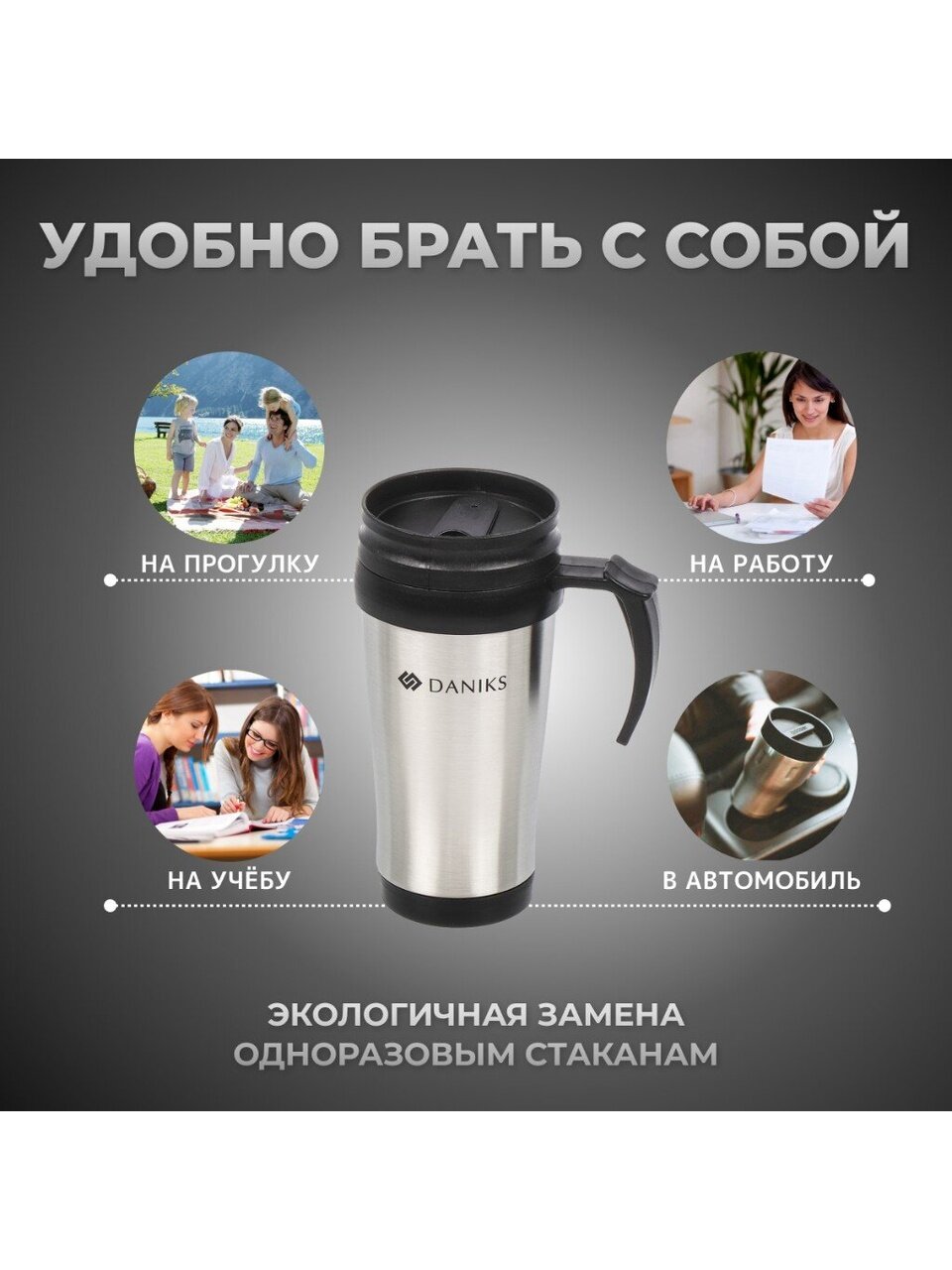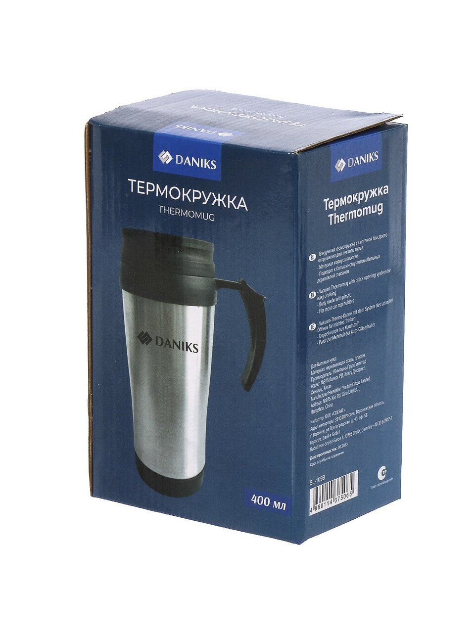 Термокружка Daniks 0.4 л: держит напитки горячими до 2 часов, корпус из нержавеющей стали, недорогой выбор для города, дома и автомобиля.