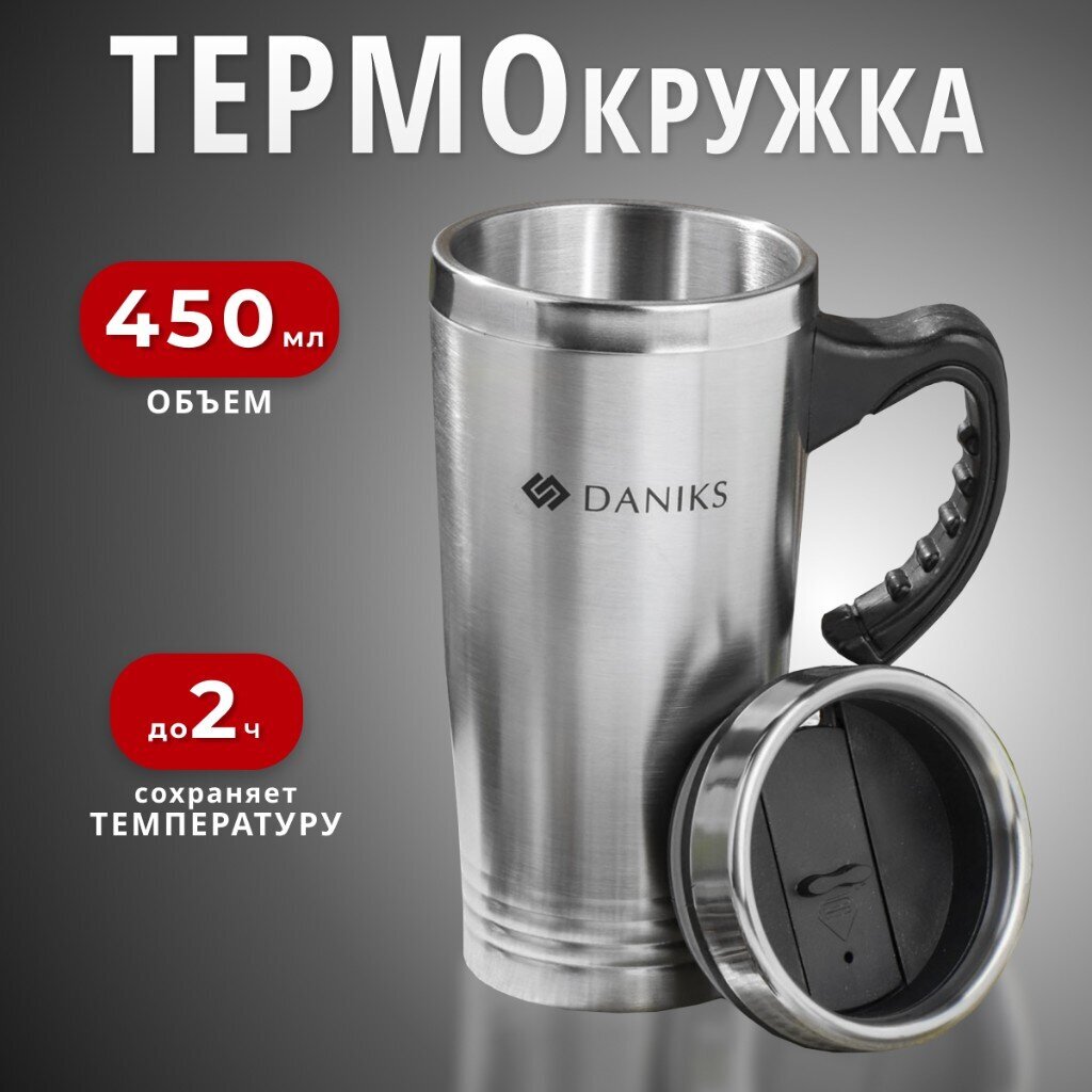 Термокружка Daniks 0.45 л из нержавеющей стали: держит тепло и холод до 2 часов, прочная, подходит для авто и города. Недорого — удобно каждый день!