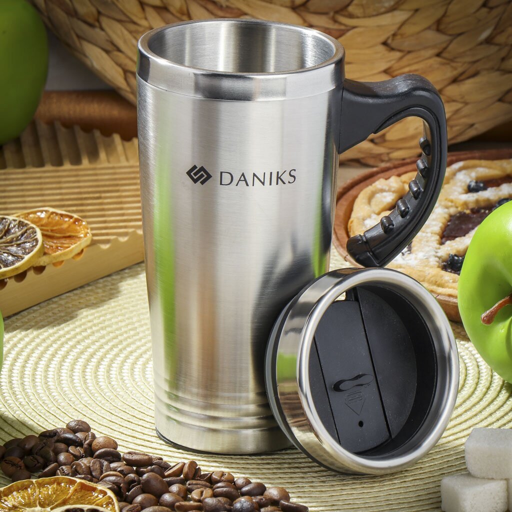 Термокружка Daniks 0.45 л держит тепло и холод до 4 часов благодаря двойным стенкам из нержавеющей стали. Это оптимально для городских поездок и работы.
