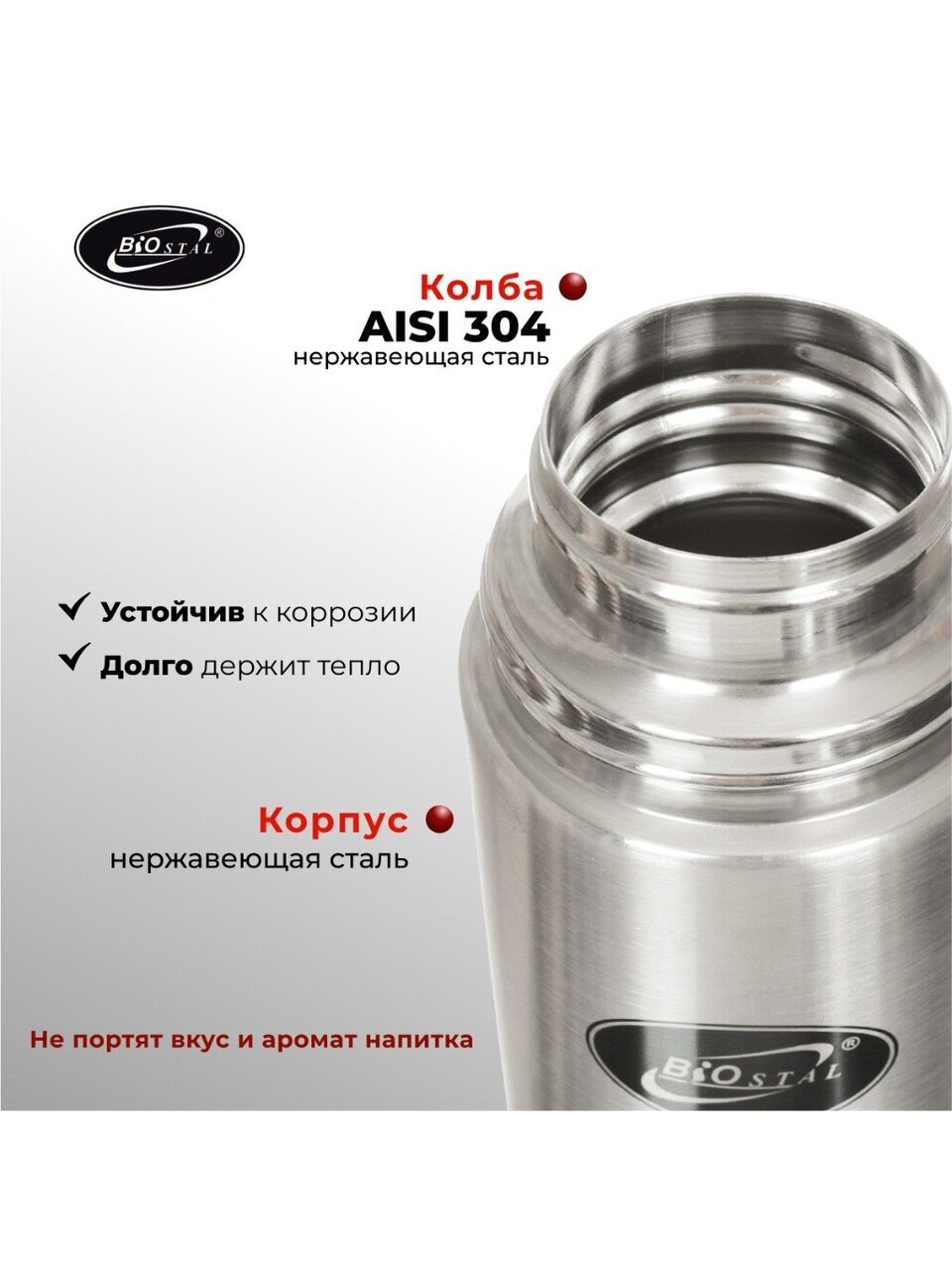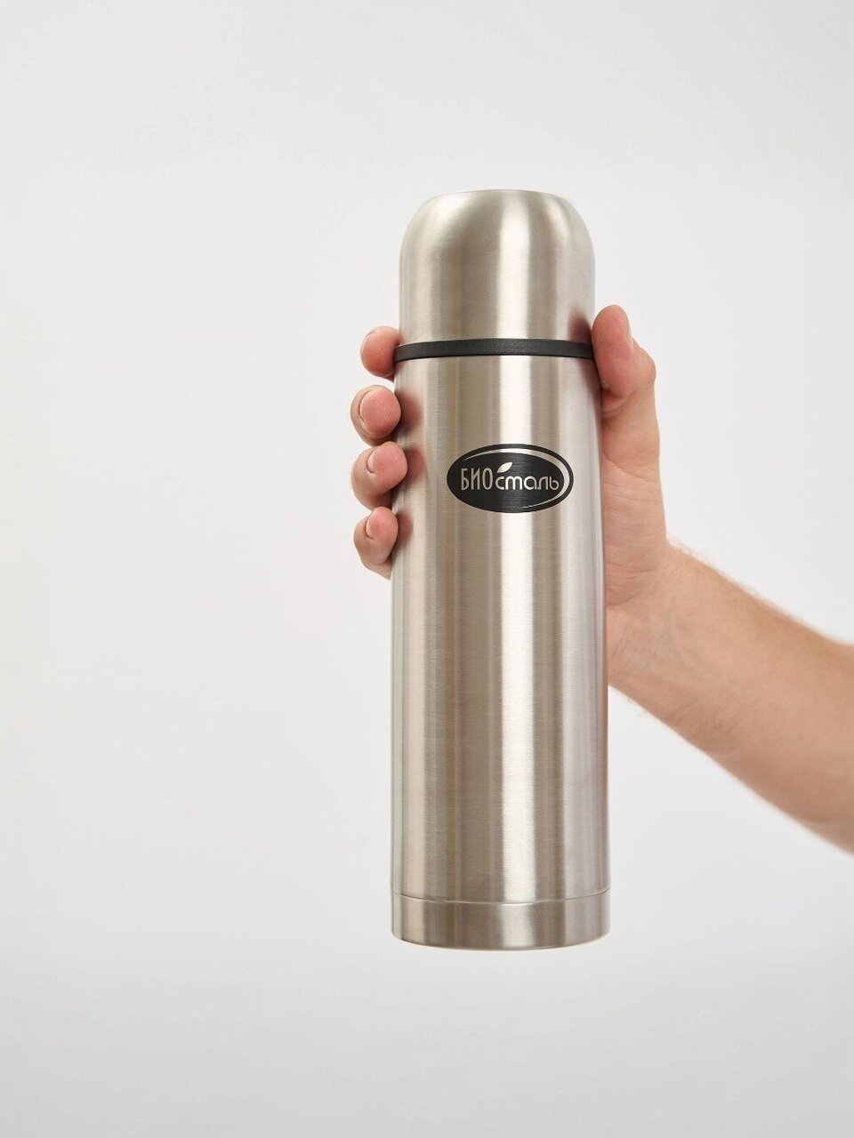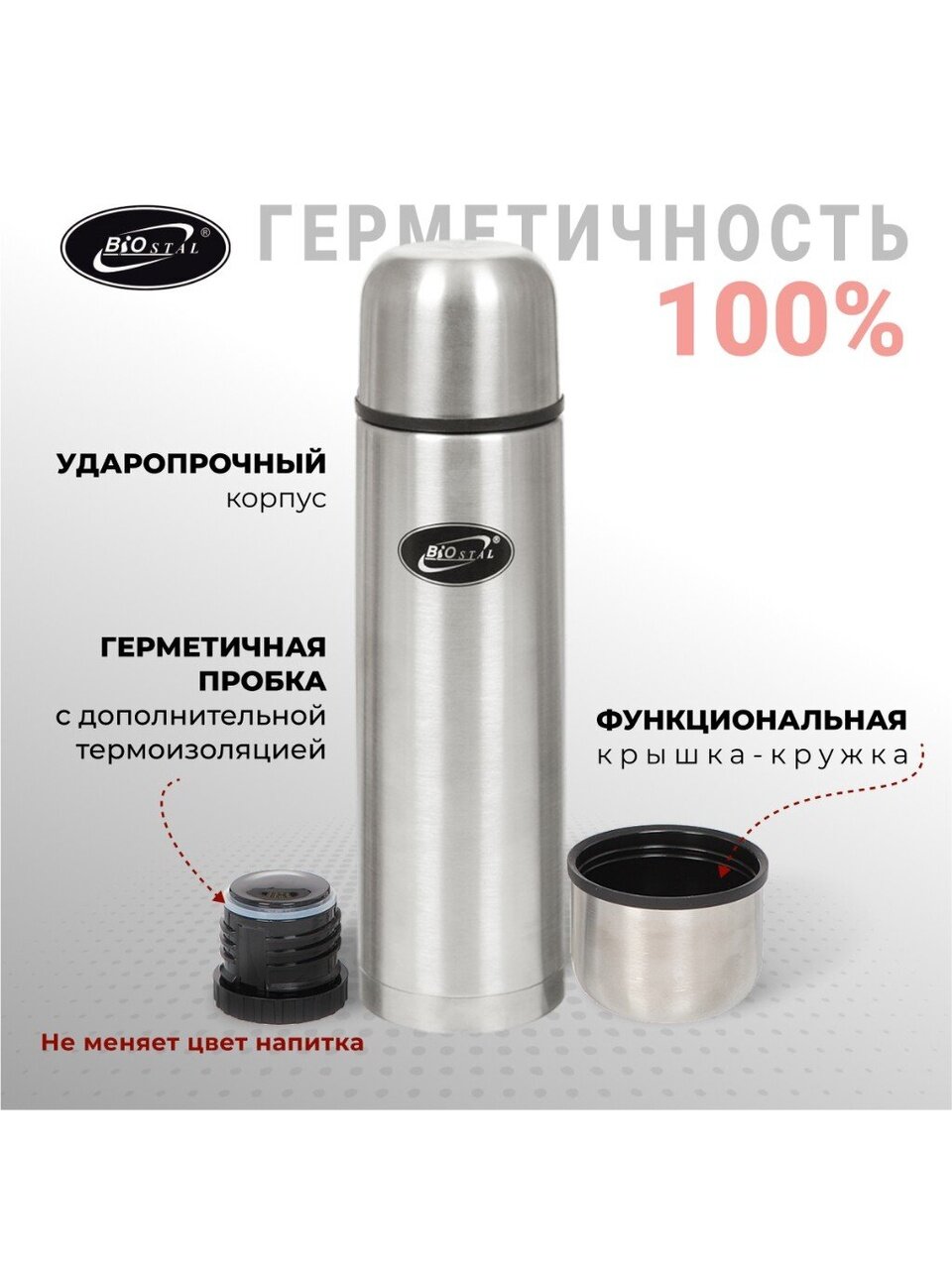 Термос Biostal 1 л из нержавеющей стали: сохраняет напитки горячими до 32 часов, холодными до 40 часов. Идеален для дома, города, поездок. Ударопрочный корпус, узкая горловина — удобно наливать и мыть.