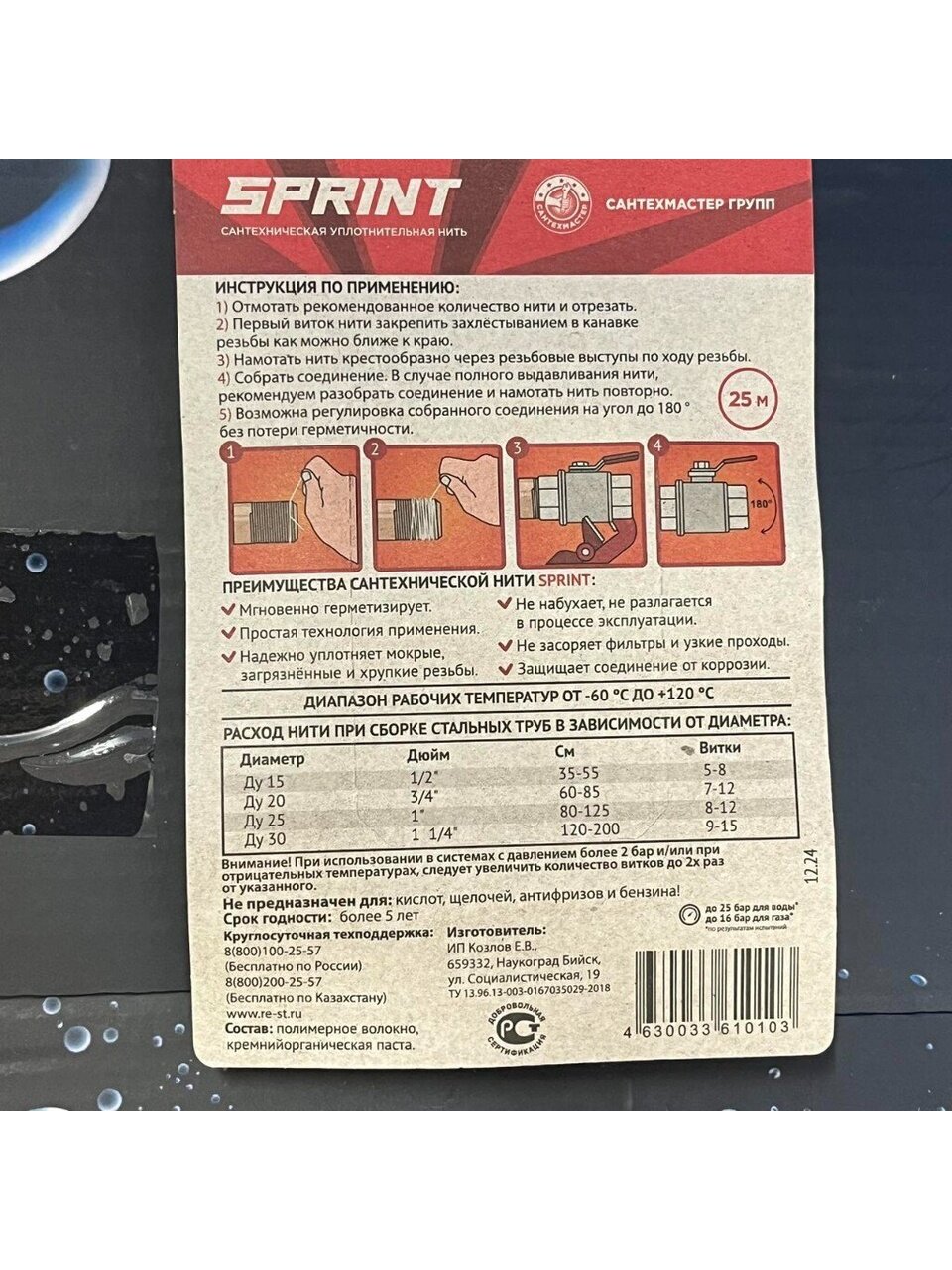 SPRINT — новая сантехническая полимерная нить российского производства. Нить имеет плоское сечение и улучшенную пропитку. Надежно герметизирует металлические и пластиковые резьбы, защищает поверхность резьбы от коррозии, соединение остается герметичным в условиях вибрации и его можно регулировать на угол до 180. Нить SPRINT идеально подойдет для срочного ремонта или быстрого монтажа.