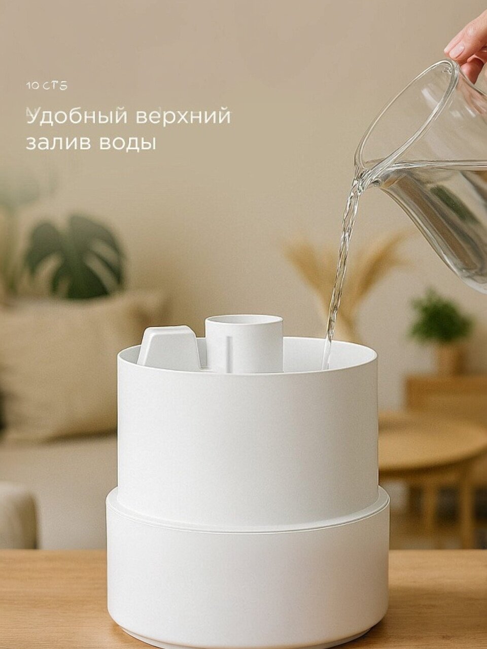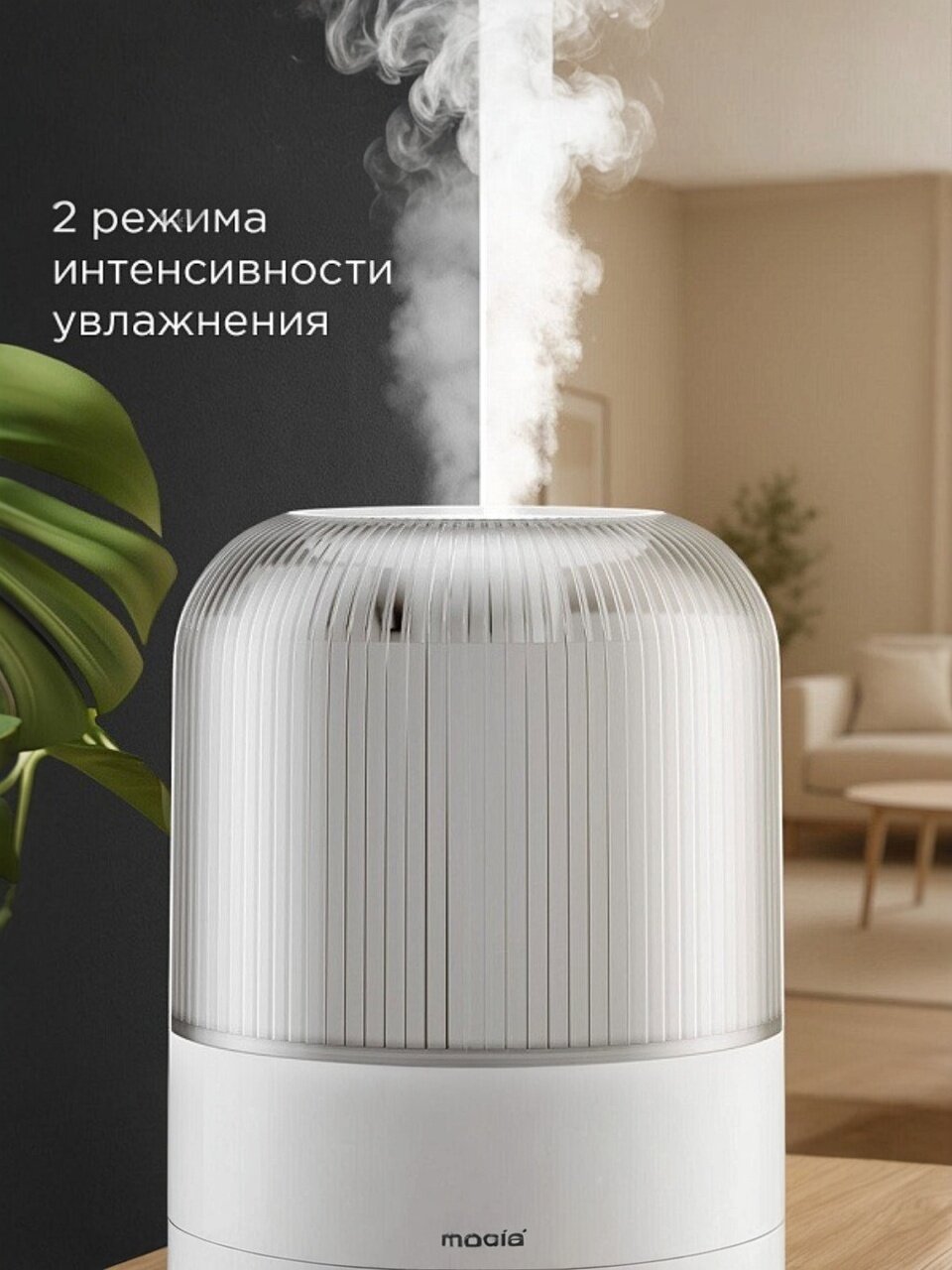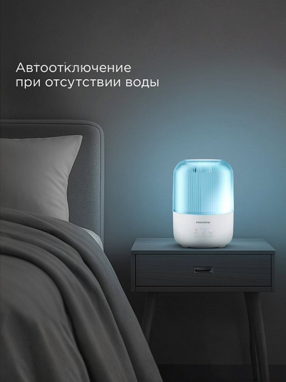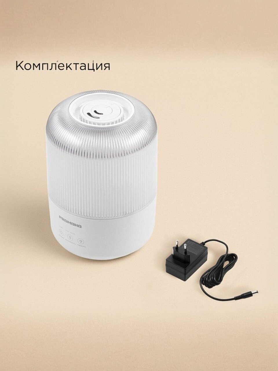 Устройство поддерживает ароматизацию воздуха, оснащено сенсорным управлением и подсветкой, автоматически отключается при отсутствии воды. Цвет — белый, гарантия — 12 месяцев.