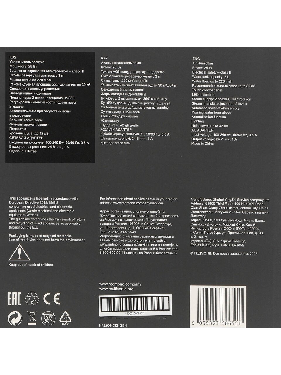 Увлажнитель воздуха Редмонд HF2204: свежий микроклимат для дома и офиса до 30 м², сенсорное управление, 3 л резервуар, тихая работа, стильный дизайн.