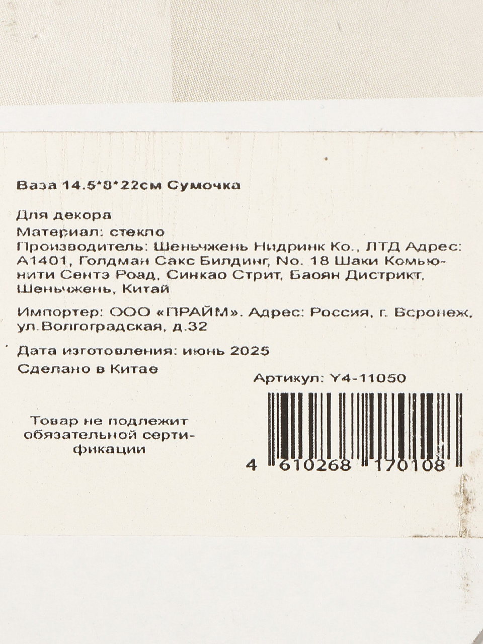 Вы можете приобрести «Ваза стекло, настольная, 14.5х8х22 см, Сумочка, медов, Y4-11050» и другие товары в нашем интернет-магазине в Обнинске по низким ценам и с бесплатным самовывозом.