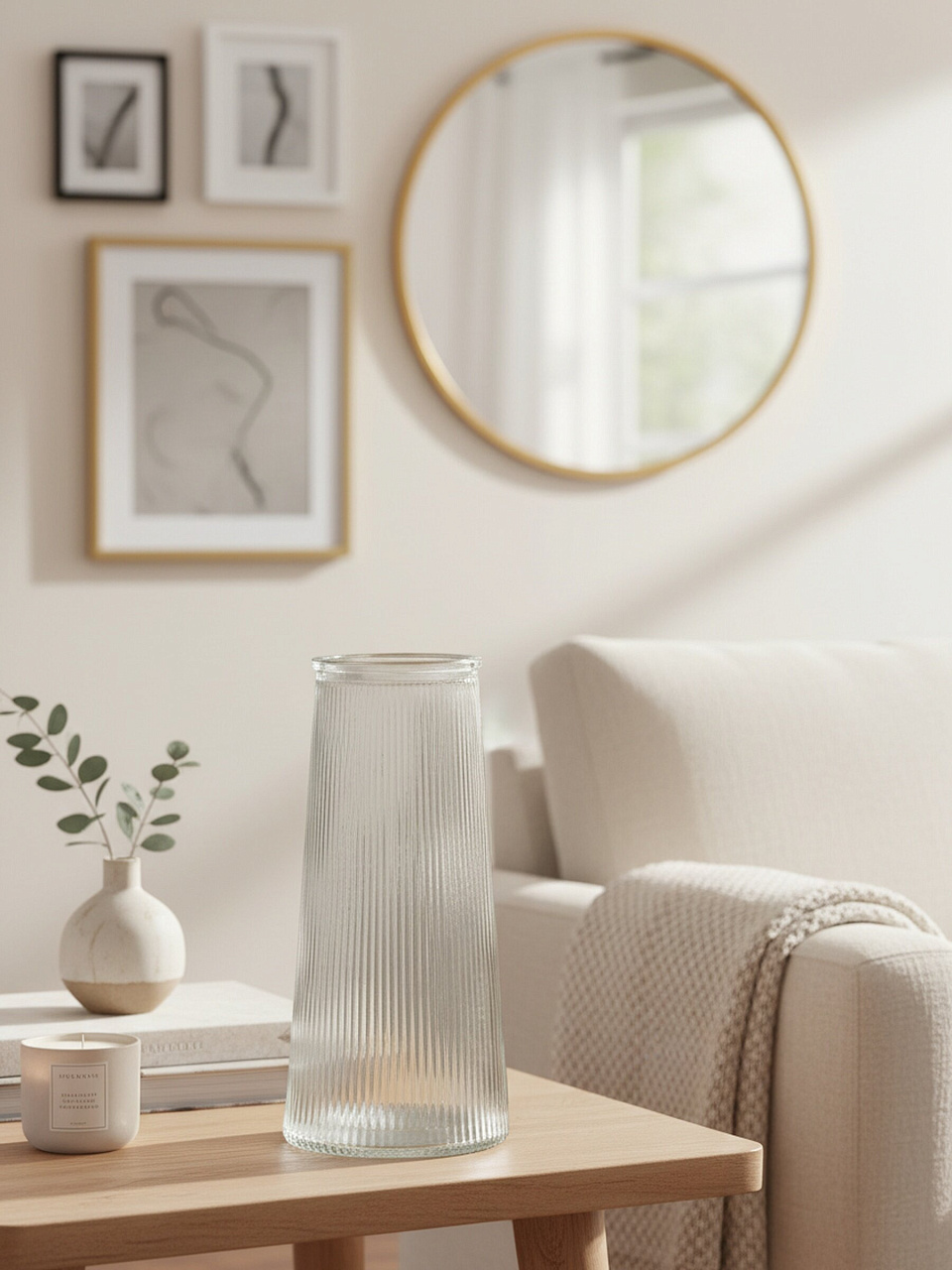 - Прозрачная настольная ваза с лаконичным вертикальным дизайном — гармонирует с любым стилем интерьера