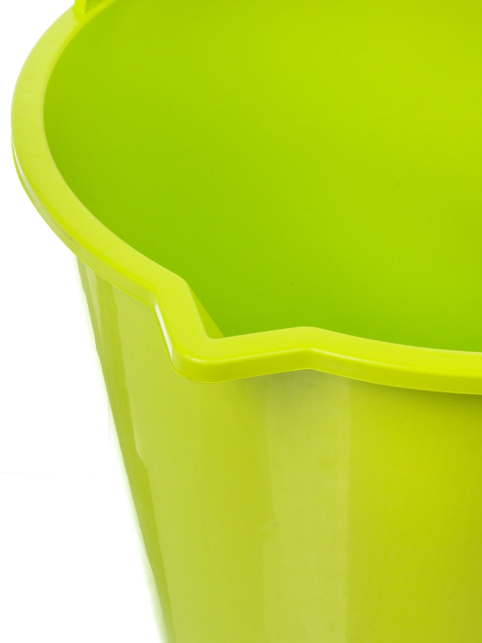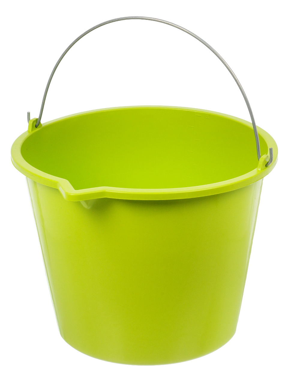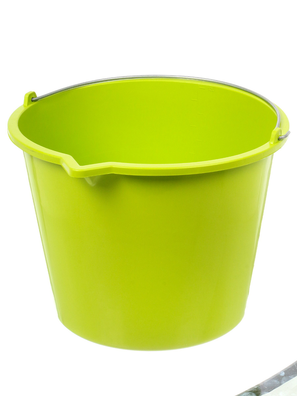 Ведро выполнено из прочного пластика, оснащено железной ручкой и сливным носиком. Покрытие отсутствует, что облегчает чистку.